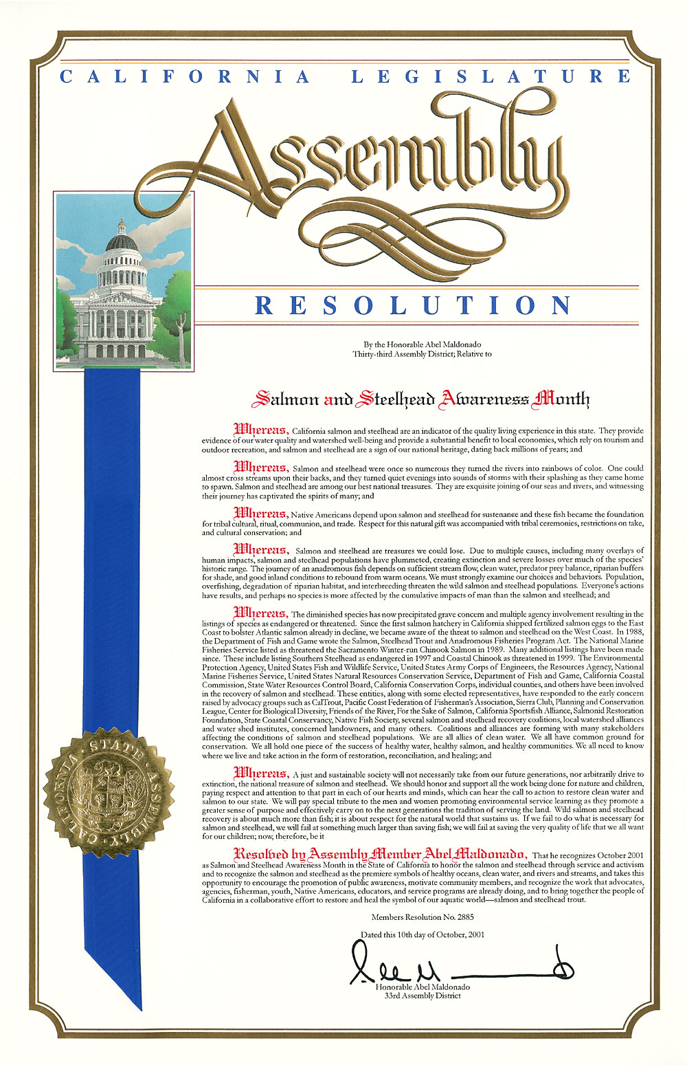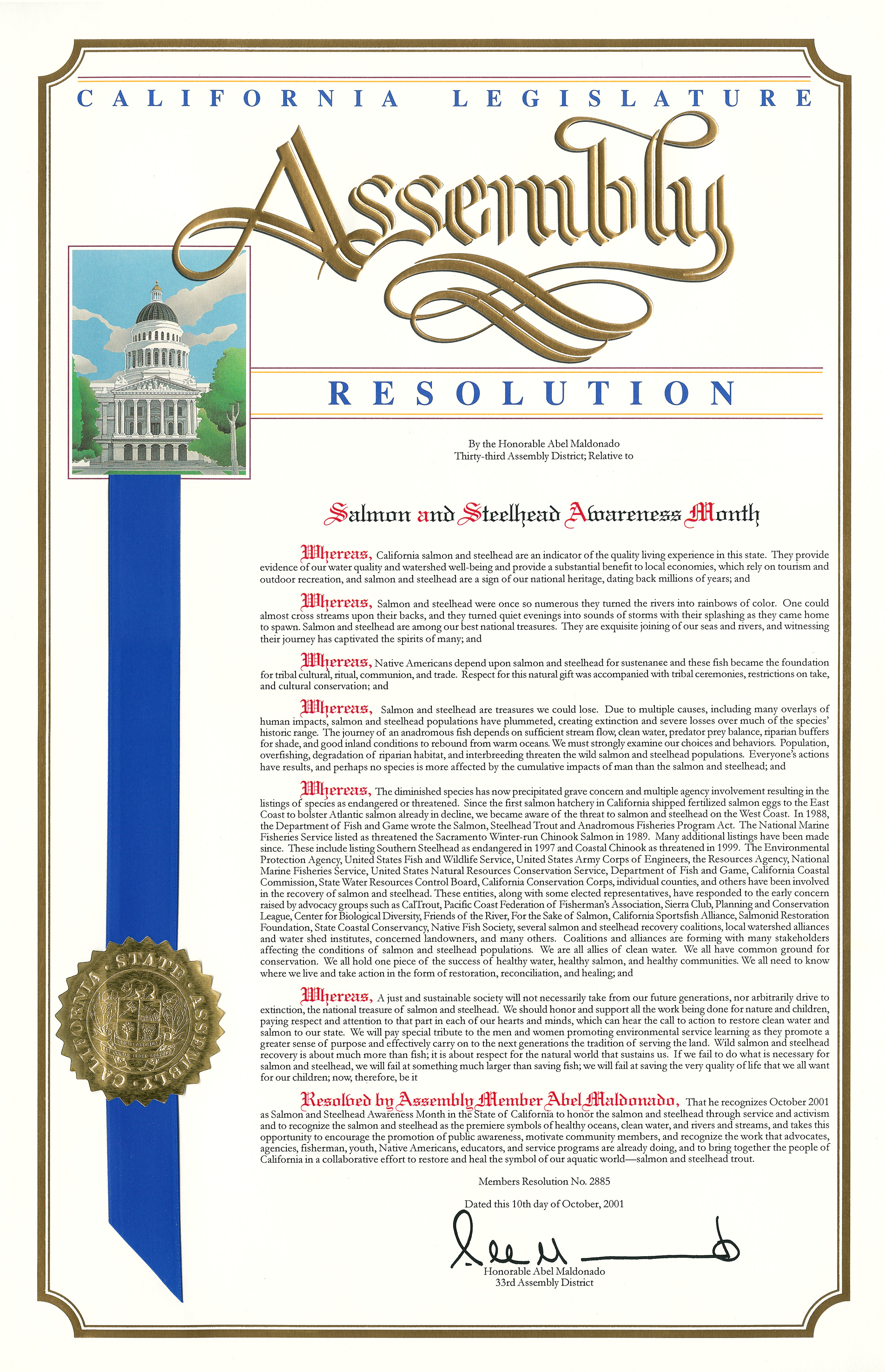 CALIFORNIA LEGISLATURE ASSEMBLY RESOLUTION By the Honorable Abel Maldonado, Thirty-third Assembly District; Relative to SALMON AND STEELHEAD AWARENESS MONTH Whereas, California salmon and steelhead are an indicator of the quality living experience in this state. They provide evidence of our water quality and watershed well-being and provide a substantial benefit to local economies, which rely on tourism and outdoor recreation, and salmon and steelhead are a sign of our national heritage, dating back millions of years; and Whereas, Salmon and steelhead were once so numerous they turned the rivers into rainbows of color. One could almost cross streams upon their backs, and they turned quiet evenings into sounds of storms with their splashing as they came home to spawn. Salmon and steelhead are among our best national treasures. They are exquisite joining of our seas and rivers, and witnessing their journey has captivated the spirits of many; and Whereas, Native Americans depend upon salmon and steelhead for sustenance and these fish became the foundation for tribal cultural, ritual, communion, and trade. Respect for this natural gift was accompanied with tribal ceremonies, restrictions on take, and cultural conservation; and Whereas, Salmon and steelhead are treasures we could lose. Due to multiple causes, including many overlays of human impacts, salmon and steelhead populations have plummeted, creating extinction and severe losses over much of the species' historic range. The journey of an anadromous fish depends on sufficient stream flow, clean water, predator prey balance, riparian buffers for shade, and good inland conditions to rebound from warm oceans. We must strongly examine our choices and behaviors. Population, overfishing, degradation of riparian habitat, and interbreeding threaten the wild salmon and steelhead populations. Everyone's actions have results, and perhaps no species is more affected by the cumulative impacts of man than the salmon ans steelhead; and Whereas, The diminished species has now precipitated grave concern and multiple agency involvement resulting in the listings of species as endangered or threatened. Since the first salmon hatchery in California shipped fertilized salmon eggs to the East Coast to bolster Atlantic salmon already in decline, we became aware of the threat to salmon and steelhead on the West Coast. In 1988, the Department of Fish and Game wrote the Salmon, Steelhead Trout and Anadromous Fisheries Program Act. The National Marine Fisheries Service listed as threatened the Sacramento Winter-run Chinook Salmon in 1989. Many additional listings have been made since. These include listing Southern Steelhead as endangered in 1997 and Coastal Chinook as threatened in 1999. The Environmental Protection Agency, United States Fish and Wildlife Service, United States Army Corps of Engineers, the Resources Agency, National Marine Fisheries Service, United States Natural Resources Conservation Service, Department of Fish and Game, California Coastal Commission, State Water Resources Control Board, California Conservation Corps, individual counties, and others have been involved in the recovery of salmon and steelhead. These entities, along with some elected representatives, have responded to the early concern raised by advocacy groups such as CalTrout, Pacific Coast Federation of Fisherman's Association, Sierra Club, Planning and Conservation League, Center for Biological Diversity, Friends of the River, For the Sake of Salmon, California Sportsfish Alliance, Salmonid Restoration Foundation, State Coastal Conservancy, Native Fish Society, several salmon and steelhead recovery coalitions, local watershed alliances and water shed institutes, concerned landowners, and many others. Coalitions and alliances are forming with many stakeholders affecting the conditions of salmon and steelhead populations. We are all allies of clean water. We all have common ground for conservation. We all hold one piece of the success of healthy water, healthy salmon, and healthy communities. We all need to know where we live and take in the form of restoration, reconciliation, and healing; and Whereas, A just and sustainable society will not necessarily take from our future generations, nor arbitrarily drive to extinction, the national treasure of salmon and steelhead. We should honor and support all the work being done for nature and children, paying respect and attention to that part in each of our hearts and minds, which can hear the call to action to restore clean water and salmon to our state. We will pay special tribute to the men and women promoting environmental service learning as they promote a greater sense of purpose and effectively carry on to the next generations the tradition of serving the land. Wild salmon and steelhead recovery is about much more than fish; it is about respect for the natural world that sustains us. If we fail to do what is necessary for salmon and steelhead, we will fail at something much larger than saving fish; we will fail at saving the very quality of life that we all want for our children; now, therefore be it Resolved by Assembly Member Abel Maldonado, That he recognizes October 2001 as Salmon and Steelhead Awareness Month in the State of California to honor the salmon and steelhead through service and activism and to recognize the salmon and steelhead as the premiere symbols of healthy oceans, clean water, and rivers and streams, and takes this opportunity to encourage the promotion of public awareness, motivate community members, and recognize the work that advocates, agencies, fisherman, youth, Native Americans, educators, and service programs are already doing, and to bring together the people of California in a collaborative effort to restore and heal the symbol of our aquatic world - salmon and steelhead trout. Members Resolution No. 2885 Dated this 10th day of October, 2001 Honorable Abel Maldonado |