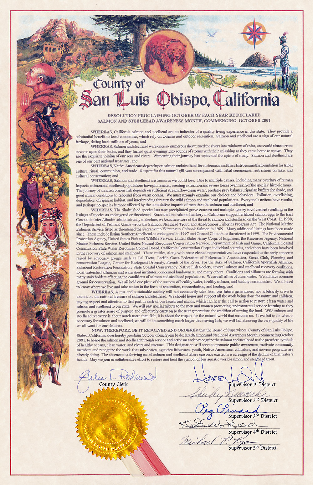 IN THE BOARD OF SUPERVISORS Date: 2nd day October, 2001 PRESENT: Supervisors ABSENT: RESOLUTION NO. 2001-392 The following resolution is hereby offered and read: WHEREAS, California salmon and steelhead are an indicator of a quality living experience in this state. They provide a substantial benefit to local economies, which rely on tourism and outdoor recreation. Salmon and steelhead are a sign of our natural heritage, dating back millions of years; and WHEREAS, Salmon and steelhead were once so numerous they turned the rivers into rainbows of color, one could almost cross streams upon their backs, and they turned quiet evenings into sounds of storms with their splashing as they came home to spawn. They are the exquisite joining of our seas and rivers. Witnessing their journey has captivated the spirits of many. Salmon and steelhead are one of our best national treasures; and WHEREAS, Native Americans depend upon salmon and steelhead for sustenance and these fish became the foundation for tribal culture, ritual, communion, and trade. Respect for this natural gift was accompanied with tribal ceremonies, restrictions on take, and cultural conservation; and WHEREAS, Salmon and steelhead are treasures we could lose. Due to multiple causes, including many overlays of human impacts, salmon and steelhead populations have plummeted, creating extinction and severe losses over much of the species' historic range. The journey of an anadromous fish depends on sufficient stream flow, clean water, predator prey balance, riparian buffers for shade, and good inland conditions to rebound from warm oceans. We must strongly examine our choices and behaviors. Pollution, overfishing, degradation of riparian habitat, and interbreeding threaten the wild salmon and steelhead populations. Everyone's actions have results, and perhaps no species is more affected by the cumulative impacts of man then the salmon and steelhead; and WHEREAS, The diminished species has now precipitated grave concern and multiple agency involvement resulting in the listings of species as endangered or threatened. Since the first salmon hatchery in California shipped fertilized salmon eggs to the East Coast to bolster Atlantic salmon already in decline, we became aware of the threat to salmon and steelhead on the West Coast. In 1988, the Department of Fish and Game wrote the Salmon, Steelhead Trout, and Anadromous Fisheries Program Act. The National Marine Fisheries Service listed as threatened the Sacramento Winter-run Chinook Salmon in 1989. Many additional listings have been made since. These include listing Southern Steelhead as endangered in 1997 and Coastal Chinook as threatened in 1999. The Environmental Protection Agency, United States Fish and Wildlife Service, United States Army Corps of Engineers, the Resources Agency, National Marine Fisheries Service, United States Natural Resources Conservation Service, Department of Fish and Game, California Coastal Commission, State Water Resources Control Board, California Conservation Corps, individual counties, and others have been involved in the recovery of salmon and steelhead. These entities, along with some elected representatives, have responded to the early concerns raised by advocacy groups such as Cal Trout, Pacific Coast Federation of Fisherman's Association, Sierra Club, Planning and Conservation League, Center for Biological Diversity, Friends of the River, For the Sake of Salmon, California Sportsfish Alliance, Salmonid Restoration Foundation, State Coastal Conservancy, Native Fish Society, several salmon and steelhead recovery coalitions, local watershed alliances and watershed institutes, concerned landowners, and many others. Coalitions and alliances are forming with many stakeholders affecting the conditions of salmon and steelhead populations. We are all allies of clean water. We all have common ground for conservation. We all hold one piece of the success of healthy water, healthy salmon, and healthy communities. We all need to know where we live and take action in the form of restoration, reconciliation, and healing; and WHEREAS, A just and sustainable society will not necessarily take from our future generations, nor arbitrarily drive to extinction, the national treasure of salmon and steelhead. We should honor and support all the work being done for nature and children, paying respect and attention to that part in each of our hearts and minds, which can hear the call to action to restore clean water and salmon and steelhead to our state. We will pay special tribute to the men and women promoting environmental service learning as they promote a greater sense of purpose and effectively carry on to the next generations the tradition of serving the land. Wild salmon and steelhead recovery is about much more than fish; it is about the respect for the natural world that sustains us. If we fail to do what is necessary for salmon and steelhead, we will fail at something much larger than saving fish; we will fail at saving the very quality of life we all want for our children. NOW, THEREFORE, BE IT RESOLVED AND ORDERED that the Board of Supervisors, County of San Luis Obispo, State of California, does hereby proclaim October of each year be declared Salmon and Steelhead Awareness Month, commencing October 2001, to honor the salmon and steelhead through service and activism and to recognize the salmon and steelhead as the premiere symbols of healthy oceans, clean water, and rivers and streams. This designation will serve to promote public awareness, motivate community members and recognize the work that advocates, agencies fishermen, youth, Native Americans, educators, and service programs are already doing. The absence of a thriving run of salmon and steelhead where one once existed is a sure sign of the decline of that water's health. May we join in collaborative effort to restore and heal the symbol of our aquatic world-salmon and steelhead trout. Upon motion of Supervi